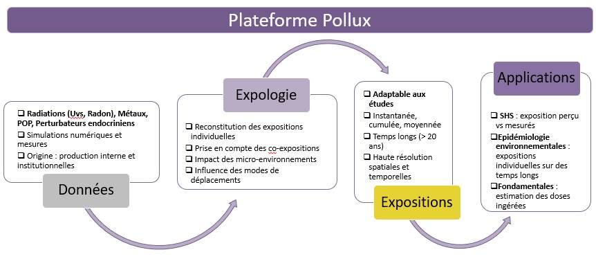 La plateforme Pollux vise à apporter un soutien technique et méthodologique aux équipes de recherche dans leurs études des expositions aux agents physiques, chimiques ou biologiques cassant l’ADN et des conséquences biologiques et cliniques associées. Cette plateforme contiendra un large volume de données sur les expositions environnementales (naturelles ou anthropogeniques) à des échelles spatiales et temporelles variées, permettant de s’adapter aux besoins des différents pôles de l’Unité (santé, environnement et espace, sciences humaines et sociales, défense). De manière concrète, les données mobilisées pourront être issues directement des travaux de l’Unité (simulations issues de développement de modèles, métrologie issues des campagnes de mesures) mais également de base de données institutionnelles. L’objectif est de fournir une reconstitution des expositions la plus fiable possible, en tenant compte des évolutions spatio-temporelles des individus et de leurs environnements géographiques, pour réduire au maximum les biais liés à l’évaluation des expositions. En plus d’un accès à des données d’expositions adaptées aux études, la plateforme fournira également des méthodologies d’analyse pour la prise en compte notamment des co/multi-expositions environnementales et de l’influence des modes de déplacements des individus sur leurs expositions. Enfin, le pôle Santé de l'Unité pourra réaliser des expériences de biologie en exposant in vitro des cellules humaines de référence en contact avec les agents étudiés. Des relations dose-effet seront obtenues et l'identification de statuts génétiques sensibles spécifiquement aux agents étudiés seront effectuées. Des comparaisons seront étidés avec d'autres agents.